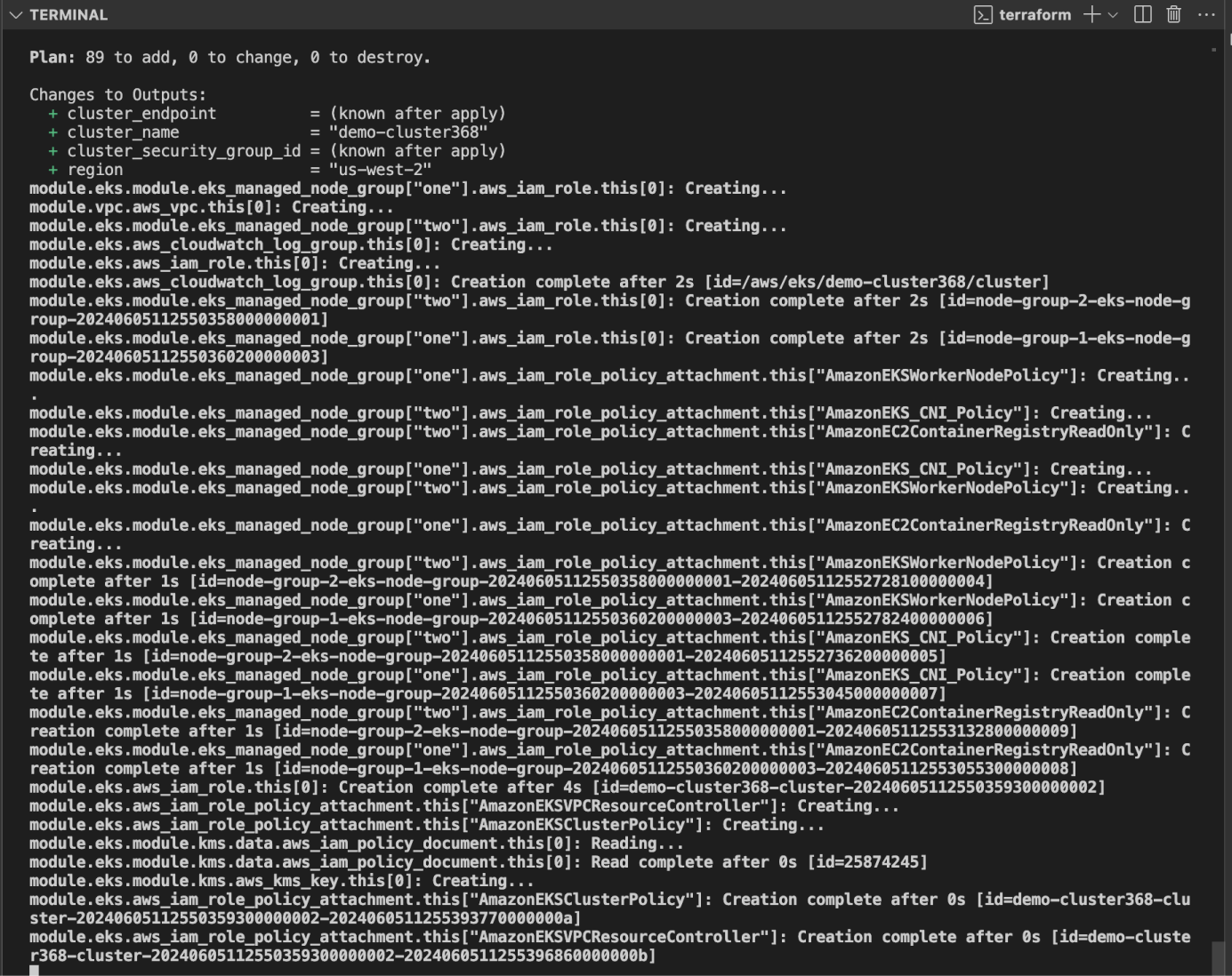 Simply put, Terraform provides and manages the infrastructure required to run an EKS cluster. Some of the resources include VPCs, subnets, IAM roles, security groups, and EC2 instances that are necessary for setting up an EKS cluster.